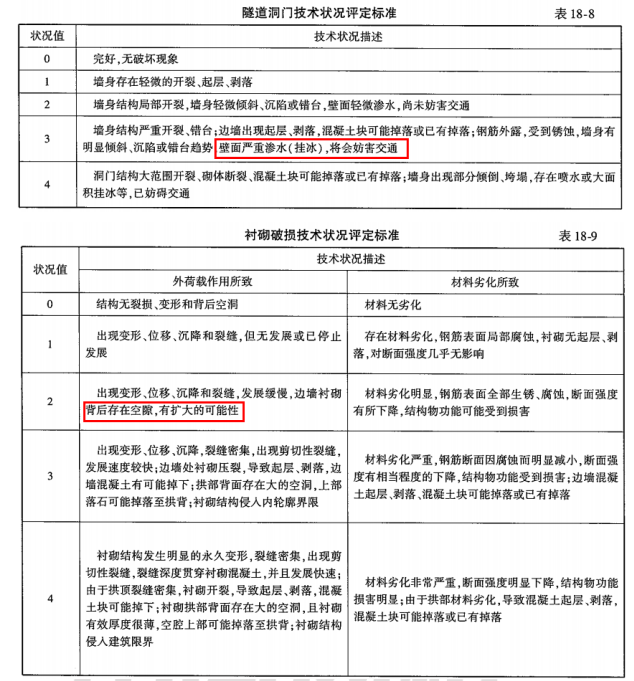 对长度为1800m、年平均日交通流量为6000pcu/d的二级公路隧道进行定期检查,检查结果包括:①洞门拱部及其附近部位出现剥落,壁面存在严重渗水和挂冰,将会妨碍交通;②衬砌存在较多裂缝,但宽度变化较小,边墙衬砌背部存在空隙,有扩大可能;③路面大面积的明显沉陷、隆起、坑洞,路面板严重错台、断裂。根据以上情况,请回答以下问题。