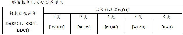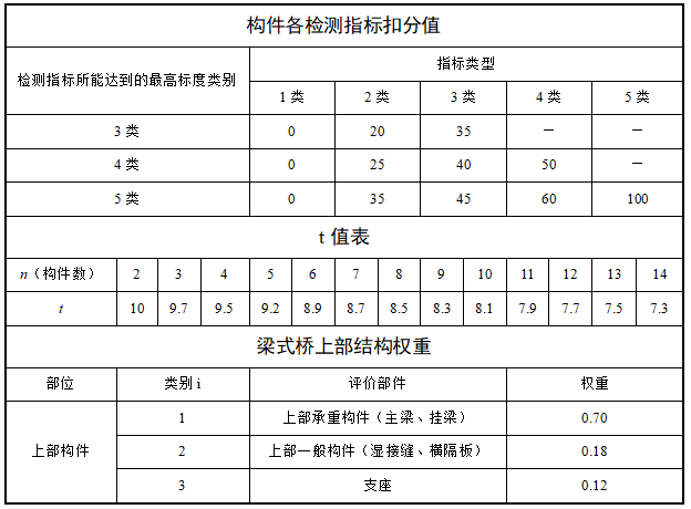 某3跨简支梁桥,每跨由4片箱梁组成,经检查发现,10片梁出现少量裂缝(宽度未超限),评定标度为2(最高为5),其余完好;2道横隔板(全桥共9道)出现局部混凝土剥落,评定标度为3(最高为4),其余完好;全桥支座完好,请根据《桥梁技术状况评定标准》(JTG/T H21-2011),回答下列问题。