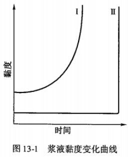 浆液黏度变化曲线浆液在固化过程中,黏度变化有两种类型,如图13-1所示。曲线I是一般浆液材料,如单液水泥浆、环氧树脂类、铬木素等,黏度逐渐增加,最后固化。随着黏度增长,浆液扩散由易到难。曲线Ⅱ表示如丙烯酰胺类浆液,凝胶前虽聚合反应开始,但黏度不变。到凝胶发生,黏度突变,顷刻形成固体,有利于注浆。