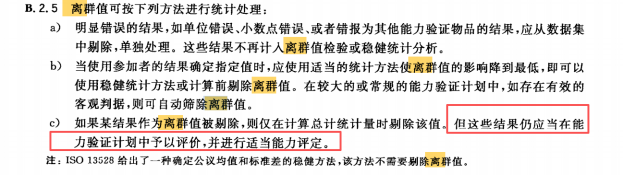 在能力验证计划中,离群值应从数据集中释放,不参与最后的分析。