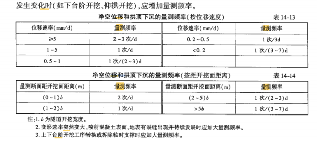 位移速率≥5mm/d时,拱顶下沉、周边位移的量测频率为(2-3)次/d