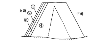 案例2【背景资料】:某水利枢纽工程由混凝土面板堆石坝、溢洪道、水电站、蓄水水库等组成。水库容积为9000万m³,发电装机容量为30万KW,混凝土面板堆石坝高度为145m,构造如下图所示:【问题】1.指出混凝土面板堆石坝构造图中①、②、③、④的名称,并判断图中上游、下游位置是否正确。