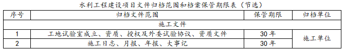 项目法人档案管理机构应依据保管期限表对项目档案进行价值鉴定,确定其保管期限,同一卷内有不同保管期限的文件时,该卷保管期限应从长。项目档案保管期限分为永久、30年和10年。施工单位除下表所列文件外,归档单位的其余文件保管期限为永久。
