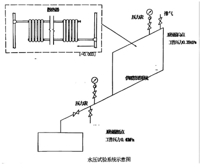 2020年11月散热器进场,安装公司对其外观和金属热强度进行了复验。2021年4月,供暖系统安装完毕,安装公司依次对管道进行了水压试验、保温、试运行和调试水压试验系统示意图如图16.2—1所示,其中水压试验压力未在设计中注明。本工程于2021年6月顺利通过验收,经核算,项目实际成本为513万元,成本降低率达5%。该供暖系统于2021年10月正式投入使用。