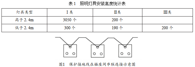在设备、材料到达施工现场后,B公司项目部依据施工图纸和施工方案,对灯具、开关及插座的安装进行技术交底,灯具类型及安装高度(见表1)。在施工质量的检查中,监理工程师发现单项三孔插座的保护接地线(PE线)在插座间串联连接(见图1),相线与中性线利用插座本体的接线端子转接供电。监理工程师要求返工,使用连接器对插座的保护接地线、相线和中性线进行分路连接,施工人员按要求整改后通过验收。