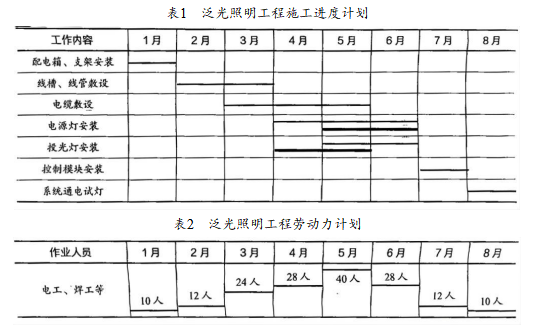 安装公司项目部进场后,依据合同、施工图、有关规范和幕墙施工进度计划等编制了泛光照明工程施工方案、施工进度计划(表1中细实线)和劳动力计划(表2)。方案中LED点源灯的安装选用吊篮施工,按进度计划租赁4台吊篮。
